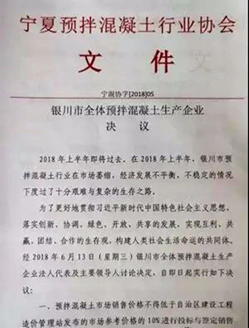 2018年上半年,整個銀川市預(yù)拌混凝土市場逐漸萎縮,同時砂石、水泥等原材料卻在不停的無序上漲,且均需要現(xiàn)金排隊買貨,于此同時工程方卻長期拖欠混凝土企業(yè)賬款,很多砼企供完灰,拿到手的卻是頂賬的房子,甚至砼企有專人售賣頂賬的房產(chǎn),因此,大部分砼企處在生死邊緣,亟待抱團取暖,共同渡過難關(guān)。因此寧夏預(yù)拌混凝土行業(yè)協(xié)會組織當(dāng)?shù)厮许牌蠼y(tǒng)一思想,決議如下: