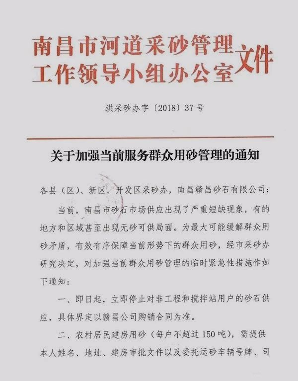 當(dāng)前,南昌市砂石市場供應(yīng)出現(xiàn)了嚴(yán)重短缺現(xiàn)象,有的地方和區(qū)域甚至出現(xiàn)無砂可供局面。為最大可能緩解群眾用砂矛盾,有效有序保障當(dāng)前形勢下的群眾用砂,經(jīng)南昌市采砂辦研究決定,對加強當(dāng)前群眾用砂管理的臨時緊急性措施作如下通知: