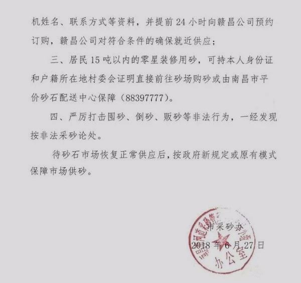 三、居民15噸以內(nèi)的零星裝修用砂,可持本人身份證和戶籍所在地村委會證明直接前往砂場購砂或由南昌市平價砂石配送中心保障(88397777)。