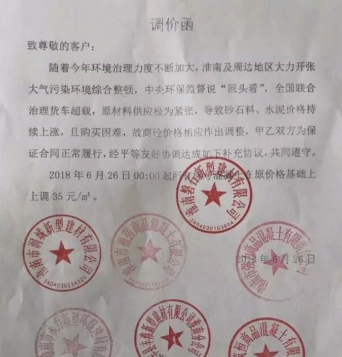 淮南,安徽省下轄地級市,位于安徽省中北部,地處長江三角洲腹地,淮河之濱,素有“中州咽喉,江南屏障”之稱,是沿淮城市群的重要節(jié)點,合肥都市圈核心城市。即使有這樣的優(yōu)越地理條件,在中央環(huán)保監(jiān)督下,全國聯(lián)合治理貨車超載中,當(dāng)?shù)厣笆⑺鄡r格依然持續(xù)上漲,且購買困難,當(dāng)?shù)仨牌鬄榱吮苊鈵盒愿偁帲WC混凝土質(zhì)量,6月26日0時起,所有混凝土在原價格基礎(chǔ)上上調(diào)35元/方。
